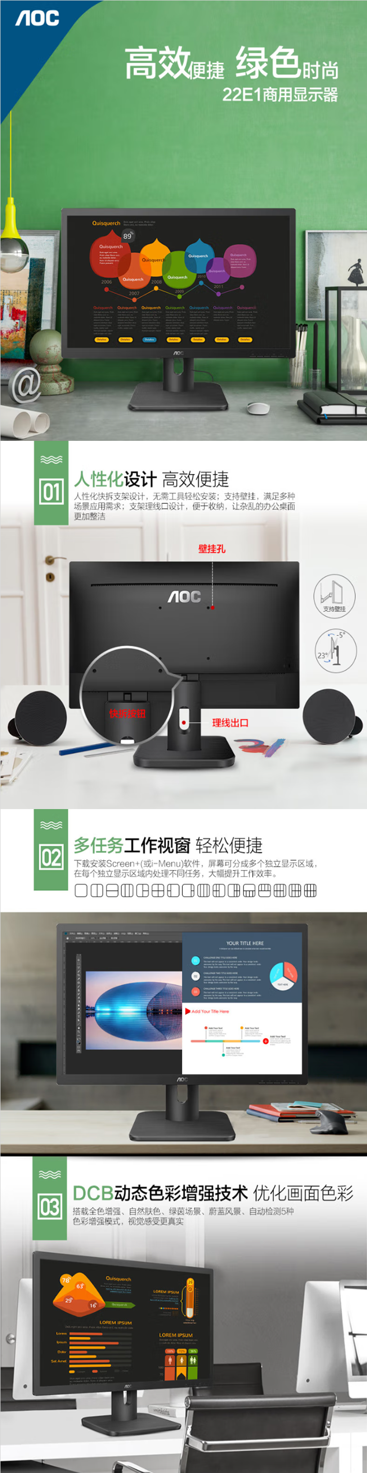 AOC 22E1 VGA/HDMI/黑色 电脑显示器 21.5英寸全高清低蓝光不闪屏 1台装