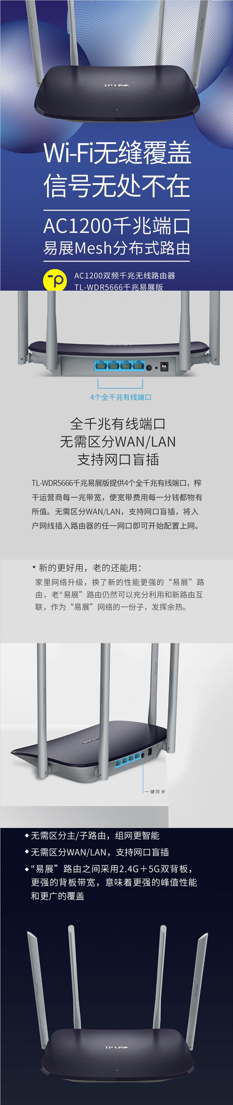 TP-LINK TL-WDR5666千兆易展版 1200M 千兆双频5G高速无线路由器 1台装
